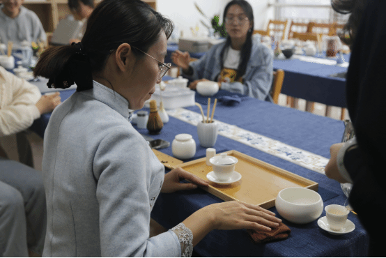 茶心语工作室的两位老师以品红茶、识盖碗、学冲泡、点茶演示进行讲解,其中刘洋老师在点茶过程中使茶汤“汤纹水脉”形成“茶”字展示了茶百戏,现场参与活动的同学和老师纷纷动手亲自体验宋代点茶技艺,近距离感受国风文化的魅力。