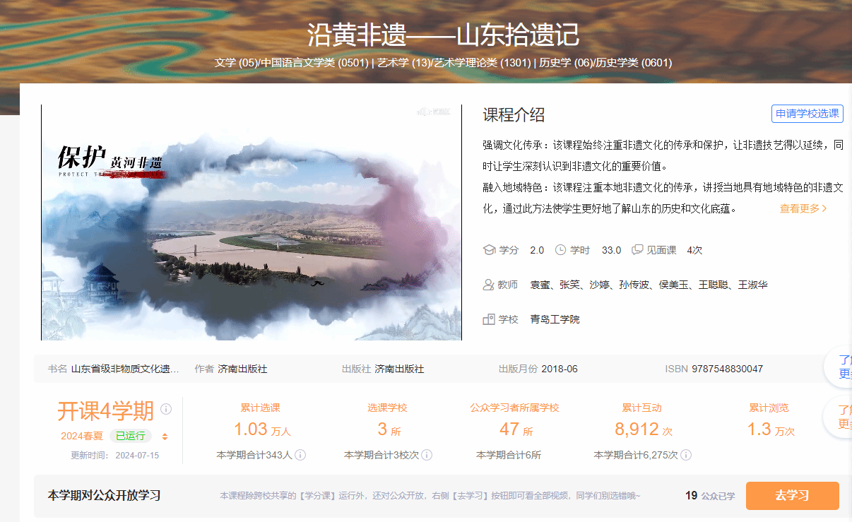 其中,《沿黄非遗》在山东省高校在线开放课程平台上线,截至目前已累计选课学生1万余人次,《黄河非遗认知与再造虚拟仿真实验》荣获山东省一流本科课程,《沽水沃黄土 胶风赓华年》等课程荣获山东省高校大学生讲思政课公开课展示活动二等三等奖、山东省高校青年教师教学比赛二等奖、山东省社区教育优秀课程资源、山东省人工智能大模型教育场景应用优秀案例、山东省继续教育数字化共享精品课程、全国大学生思政课微课暨红色资源开发成果展示活动二等奖,刘晓燕老师获评“山东学校优秀思政课教师”,信息工程实验教学中心获批山东省普通高等学校实验教学示范中心,软件工程专业入选青岛市产教融合示范专业建设项目。