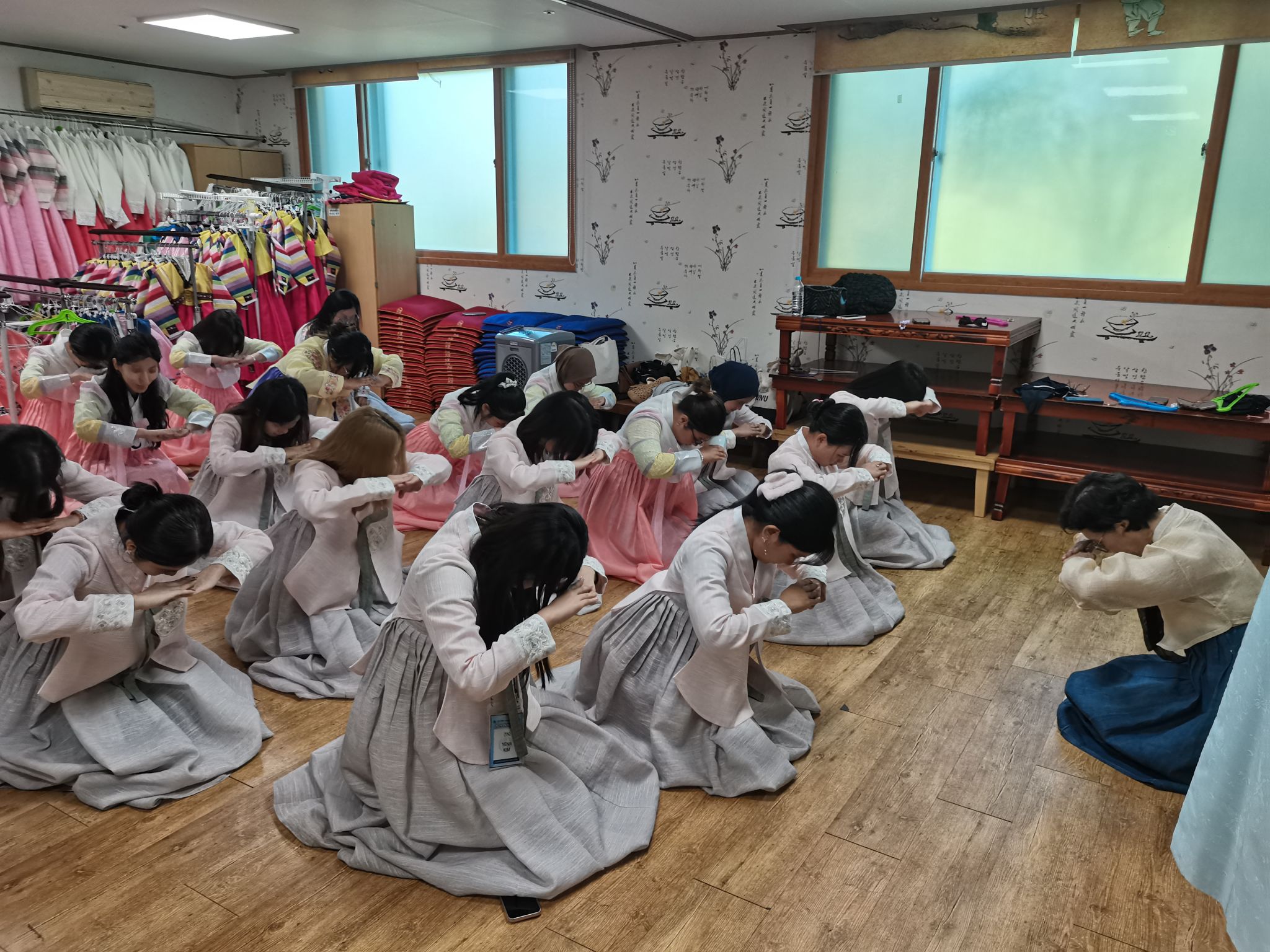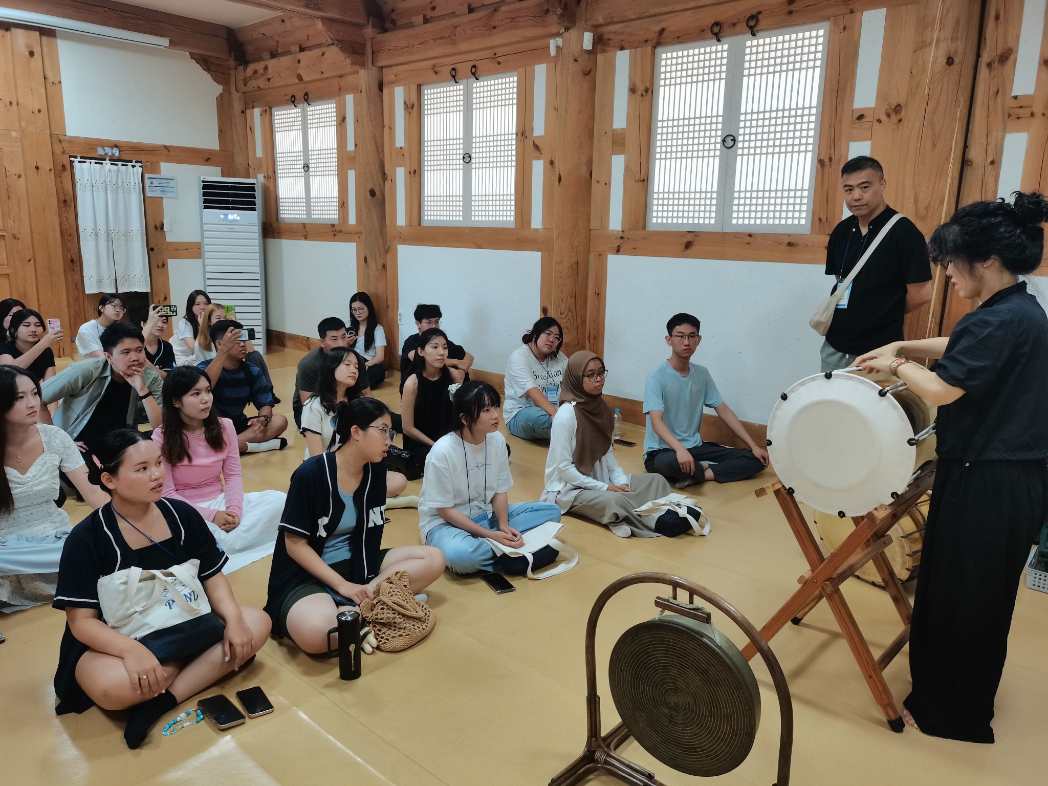 在为期一周的游学之旅中,同学们深入体验了韩国丰富的文化与传统艺术。其中最令人难忘的是身着华丽的传统韩服,学习韩国的礼仪。在这次体验中,同学们不仅了解了韩国服饰的历史背景,还亲身体验了如何行礼以及如何穿着这些精美的服装。韩国的老师们耐心地指导每一位同学,确保他们能够正确地穿戴韩服,并解释了每一种服饰背后的文化含义。随后,在韩国传统乐器体验活动中,大家分别选择了自己感兴趣的乐器,如长鼓、编磬、小金、座鼓等,经过一个多小时的合作练习,最终成功地演奏了一首美妙的乐曲。在这个过程中,釜庆大学的音乐老师给予了同学们专业的指导,帮助他们克服了初次接触新乐器的困难。同学们的演奏虽然略显生疏,但那份投入和认真却赢得了现场师生们的热烈掌声。