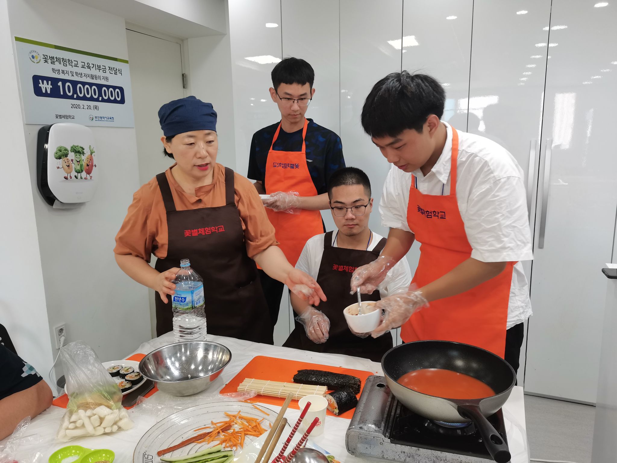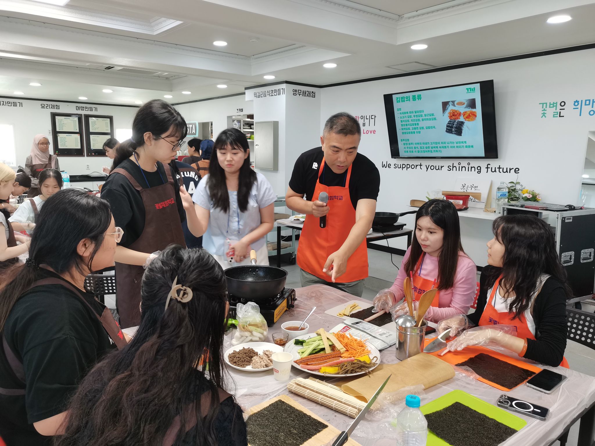 在料理制作活动中,同学们在一位慈祥的韩国老奶奶指导下学会了制作紫菜包饭和炒年糕。大家分工明确,有的负责切鱼饼和胡萝卜,有的负责炒制食材。在制作紫菜包饭时,同学们将蒸熟的米饭均匀铺在紫菜上,再加入各式配菜,用寿司帘卷起后,在刀上涂抹一些油并切成小段;而炒年糕则需要将汤汁煮沸后加入年糕和各种蔬菜快速翻炒。期间,釜庆大学的老师和同学们一起参与烹饪过程,互相交流烹饪技巧,场面温馨而欢乐。在制作完成后,同学们与韩国师生一起津津有味的品尝着自己制作的美食,分享彼此的喜悦。大家纷纷拿出手机拍照留念,记录下这份美好的回忆。