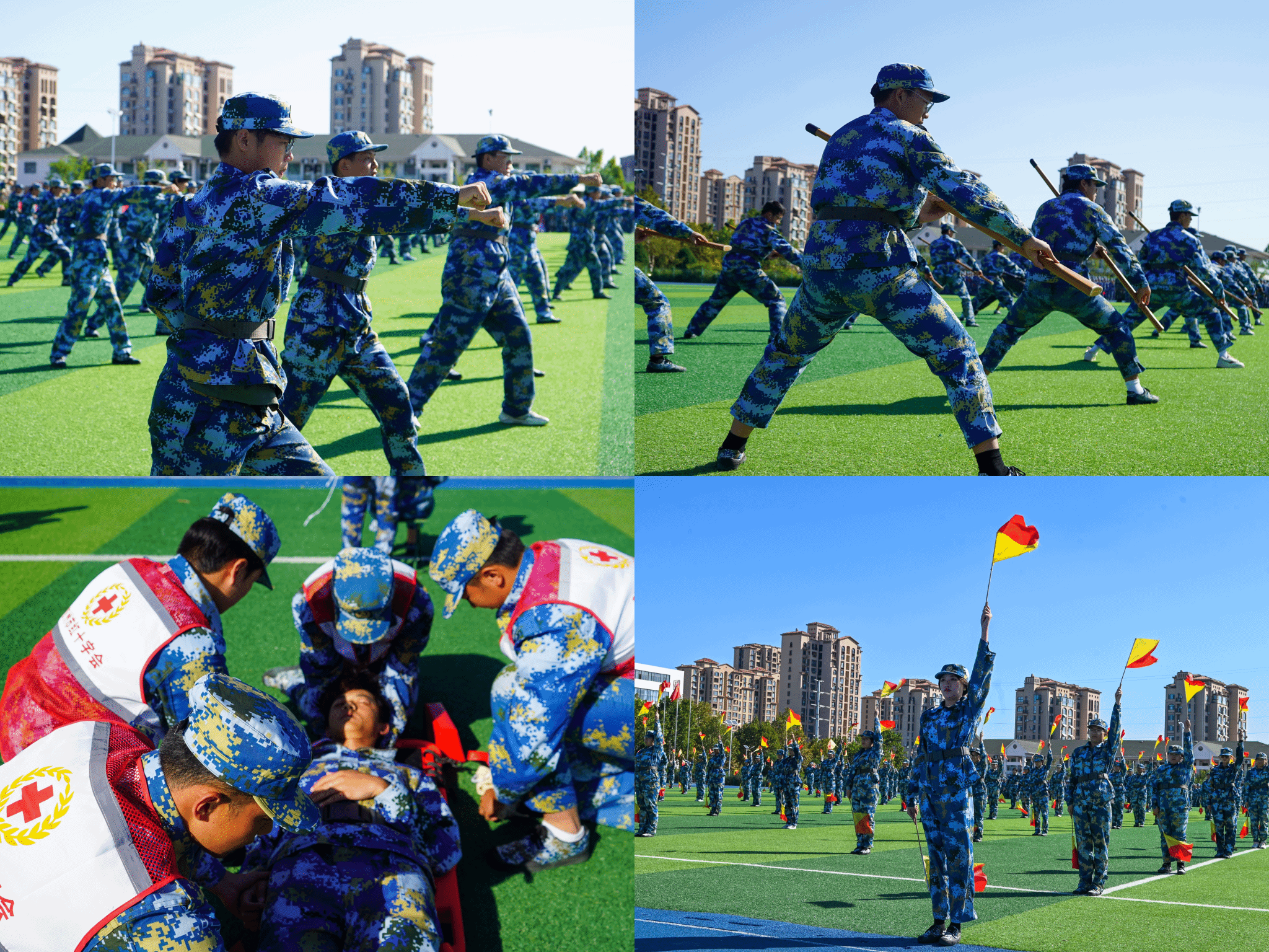 同学们展示了军体拳、刺杀操、应急救护技能、旗语操等一系列科目,伴随着铿锵有力的口令,他们目光如炬,身姿挺拔,无论是迅猛有力的擒敌动作,还是敏捷矫健的刺杀操练,每一招每一式都透露出军人般的刚毅与果敢,都让人感受到青春的激情与奋斗的力量,整个表演如雷霆万钧、震撼全场。