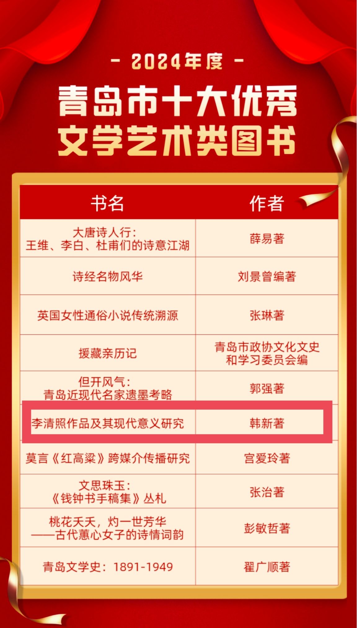 图为青岛市十大优秀文学艺术类图书榜单