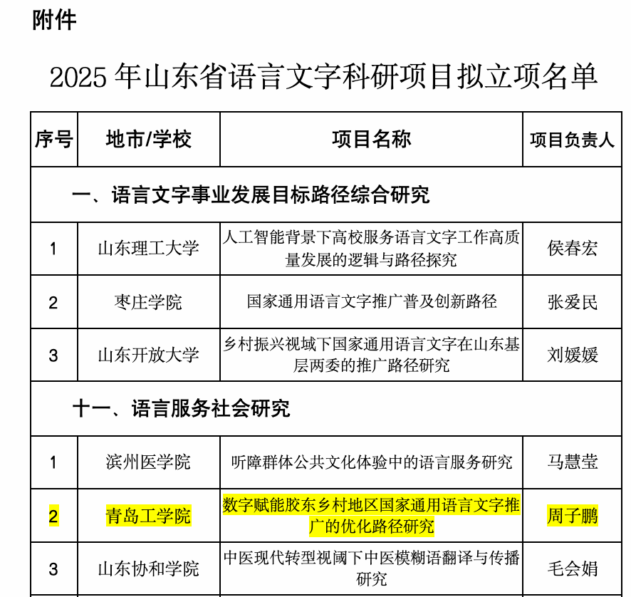 近日,山东省教育厅、山东省语言文字工作委员会公布了《2025年山东省语言文字科研项目立项名单》,经选题预申报、立项申报、专家评审等程序,全省共有66个项目获批立项。我校基础教育学院周子鹏老师主持的《数字赋能胶东乡村地区国家通用语言文字推广的优化路径研究》获批立项。