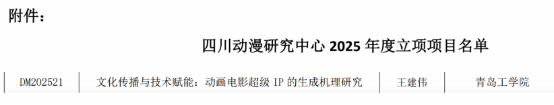 近日,开云电竞网站王建伟副教授申报的四川省哲学社会科学重点研究基地四川动漫研究中心2025年度课题《文化传播与技术赋能:动画电影超级IP的生成机理研究》成功获批立项。该课题的获批,标志着学校在文化创意与数字技术融合领域持续深耕,积极抢占文化科技创新制高点、服务国家和文化产业高质量发展的又一重要突破,充分彰显了开云电竞网站在新文科建设领域的学科优势与科研担当。