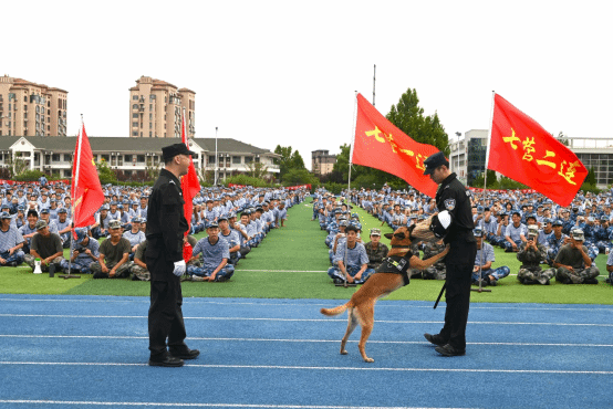 活动在激昂奋进的开场音乐中拉开帷幕,现场气氛热烈。刑侦大队警犬在训导员精准指令下,进行了精彩的技能展示,警犬从容完成高难度动作,赢得师生们的阵阵喝彩。随后,歌曲《我们都是追梦人》唱响,展现了青年一代追逐梦想、勇担使命的坚定信念。