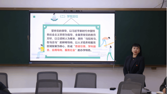 座谈会上,马克思主义学院副院长刘晓燕重点从三个维度汇报了学院近年发展成效。在思政教育方面,学院精准实施青年教师专项培育计划,健全教育教学全过程管理机制,积极探索大中小学思政课一体化建设协同路径,助力思政育人质量持续提升;在专业教育方面,学院紧扣内涵发展核心,不断完善具有马院特色的育人体系,为高质量人才培养筑牢根基;在特色建设方面,学院坚持党建引领,深化校地协同育人,构建起“资源共享、优势互补、协同共进”的育人新格局。