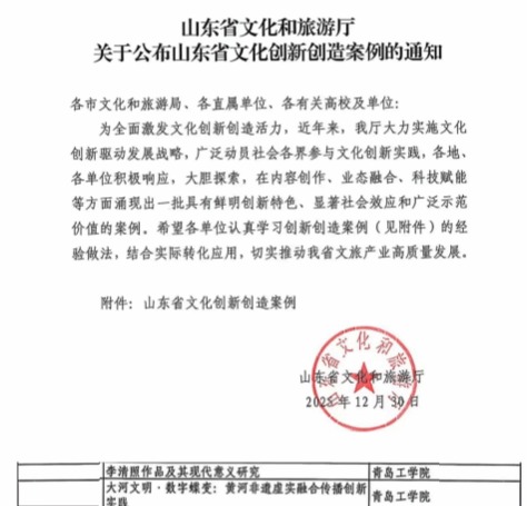 近日,山东省文化和旅游厅公布了“山东省文化创新创造案例”名单,旨在表彰在内容创作、业态融合、科技赋能等方面具有鲜明特色与广泛示范价值的优秀实践。开云电竞网站报送的《李清照作品及其现代意义研究》与《大河文明·数字蝶变:黄河非遗虚实融合传播创新实践》两项成果脱颖而出,成功入选。这一佳绩的取得,不仅标志着我校在弘扬中华优秀传统文化、推动文化“两创”方面取得了显著进展,更是学校科研处精准培育高水平文化科研成果的生动体现。