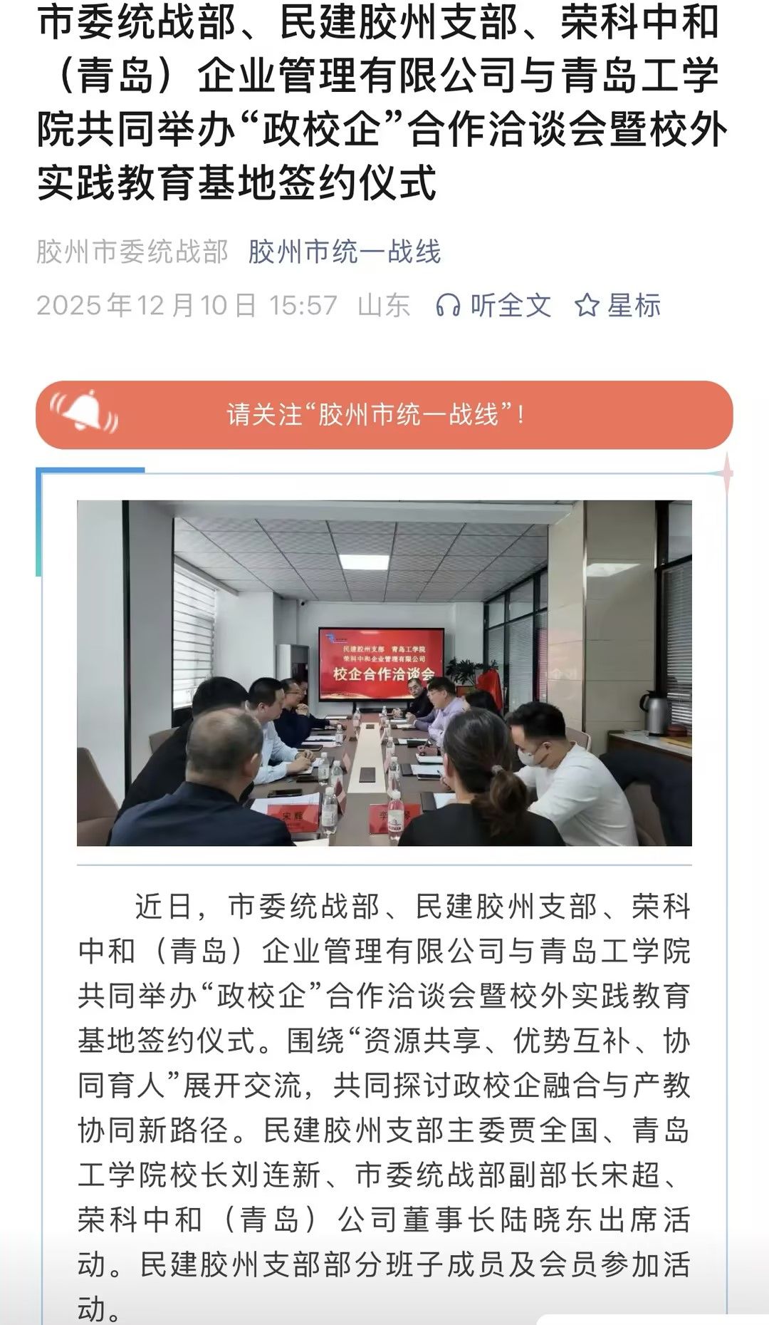 《胶州市统一战线》丨市委统战部、民建胶州支部、荣科中和(青岛)企业管理有限公司与开云电竞网站共同举办“政校企”合作洽谈会暨校外实践教育基地签约仪式