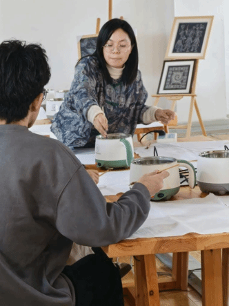 王老师向在场师生介绍了蜡染的基础知识,并用蜡刀蘸熔蜡绘花于布后以蓝靛浸染,既染去蜡,布面呈现出蓝底白花的图案,同时,作为防染剂的蜡自然龟裂,使布面呈现特殊的“冰纹”,色调素雅,风格独特,尤具魅力。师生在王老师的指导下在蜡染的技法中放松身心、感受中华民族传统文化的韵味。