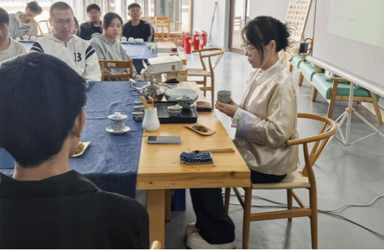 刘老师通过“历史溯源-分类解析-品鉴之道”三层脉络,系统阐述中国茶文化演变。在茶艺展演环节,从温杯洁具的细致入微,到投茶注水的精准把控,再到出汤分茶的优雅从容,每一个步骤都蕴含着刘老师深厚的文化底蕴与精湛的技艺。活动现场,师生在刘老师指导下亲历温杯、赏茶、冲泡、奉茶全流程,从动作仪轨中感悟“和敬清寂”的茶道精神。茶香氤氲间,师生不仅掌握了盖碗冲泡技法,更透过茶礼学习中国待客之道与“天人合一”的哲学智慧。