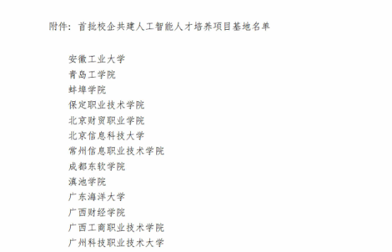 图为首批校企共建人工智能人才培养项目基地部分名单