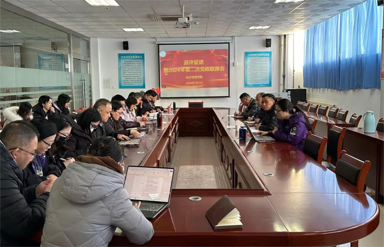 为认真回顾和反思过去一年的工作,理清2024年工作思路,明确努力方向和前进目标,2024年1月15日寒假第一天,经济管理学院召开迎评促建暨2024年第二次党政联席会,副校长李占军到会进行指导并讲话,学院党总支书记王涛、副院长姜中杰、党总支副书记朱江涛以及各专业负责人、教研室主任、学生工作负责人参加会议,会议由院长宋辉主持。