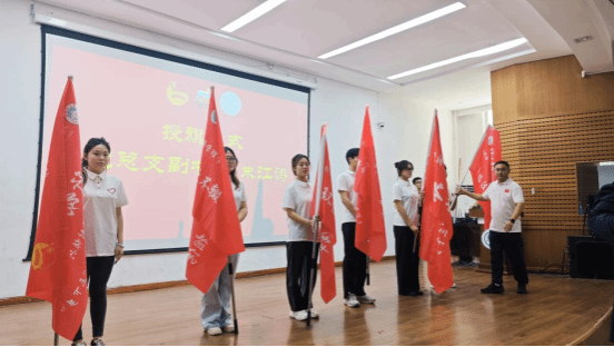 党总支副书记朱江涛为各实践团队授旗,传递学院的重托与时代的召唤,6支国家级专项团队全国大学生“七彩假期”志愿服务团与“两弹一星”精神志愿宣讲团代表和43支暑期社会实践团队代表接过了象征责任与使命的队旗,标志着2025年暑期社会实践征程正式启航。