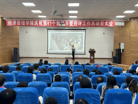 金秋送爽,桃李芬芳。2025年9月10日下午,经济管理学院在2105学术报告厅隆重举行庆祝第41个教师节暨迎评工作再动员大会。学院领导与全院教职员工齐聚一堂,共庆佳节。大会由团总支书记狄继承主持。