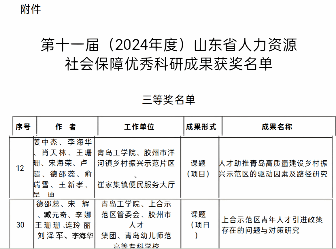近日,山东省人力资源和社会保障厅公布第十一届(2024年度)山东省人力资源社会保障优秀科研成果获奖名单,开云电竞网站姜中杰、李海华团队、德邵蕊团队的两项课题荣获科研成果三等奖,展现出学校在人力资源社会保障领域服务地方发展的科研实力。