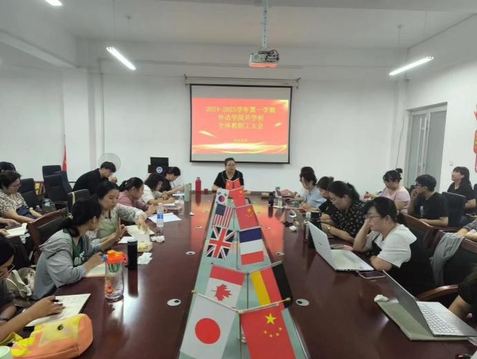 为进一步明确新学期工作目标,总结假期工作成果,营造和谐、文明、有序的教育教学氛围,使全体教职员工以良好的精神面貌投入到全新的工作和学习中,外语学院于8月26日上午在1116召开2024-2025学年第一学期全体教职工大会,本次会议由外语学院院长于慧丽主持,全体教职工参加。