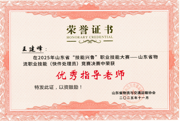 近期,在2025年山东省“技能兴鲁”职业技能大赛中,我校物流管理专业教师王建峰凭借扎实的专业知识和出色的实践能力,荣获山东省物流职业技能“快件处理员”赛项一等奖、“快递员”赛项二等奖、“仓储管理员”赛项三等奖,我校获优秀组织奖,为学校赢得了荣誉。