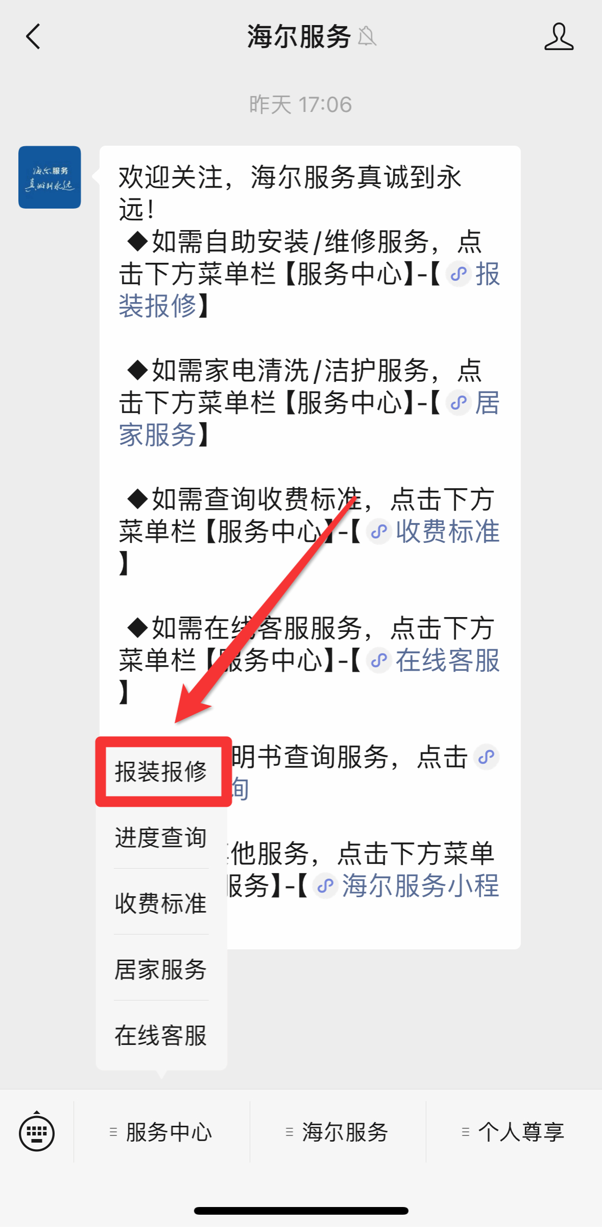 二、进入公众号主页,点击“服务中心”——“报装报修”