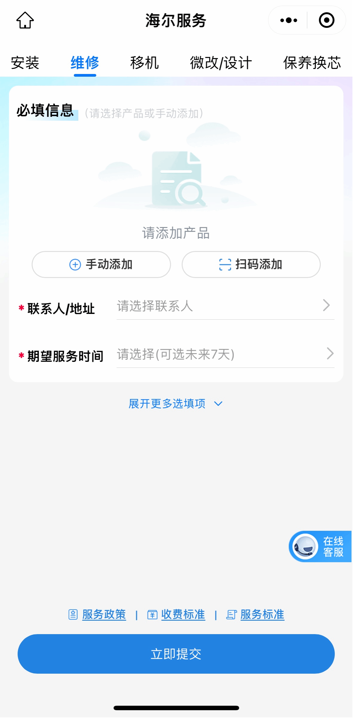 四、添加设备——填写“故障类型”——联系人/地址——期望服务时间——立即提交。(扫码添加:扫描空调内机条形码)