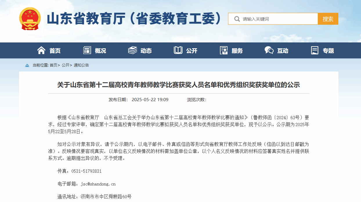 近日,山东省教育厅发布了《关于山东省第十二届高校青年教师教学比赛获奖人员名单和优秀组织奖获奖单位的公示》的通知,我校获得二等奖1项,三等奖1项。马克思主义学院马小晴老师获得二等奖,基础教育学院张聪聪老师获得三等奖。